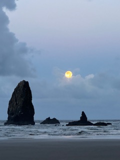 Super Moon before sunrise at Oregon’s Cannon Beach, October 2024, on a retreat with besties.